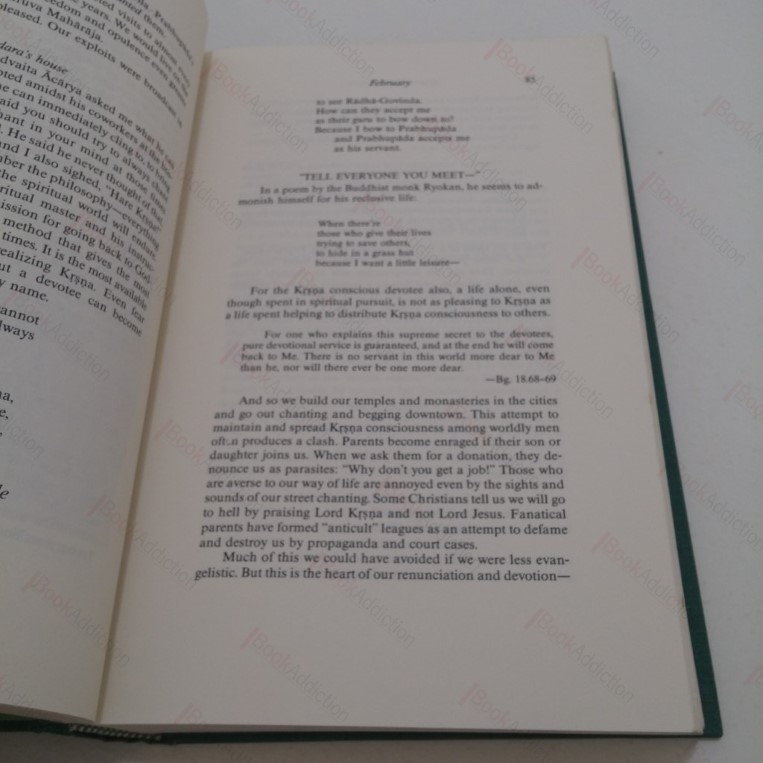 444pp. From an edition limited to 3,000 copies. In green cloth-covered boards with gilt titles front and spine. Bright green endpapers. Sparsely illustrated. (Boards just a little bruised at spine ends; there is a blank sticker on the front free endpaper). First few pages show a little old damp warping at top, else internally neat, clean, bright and tight. In its original, edge worn, illustrated dust jacket, chapped on recto upper edge. Day-to-day account of a Kirshna devout, it is a portrait tracing private moments before the Deities and on pilgrimage to the holiest of Indian cities.