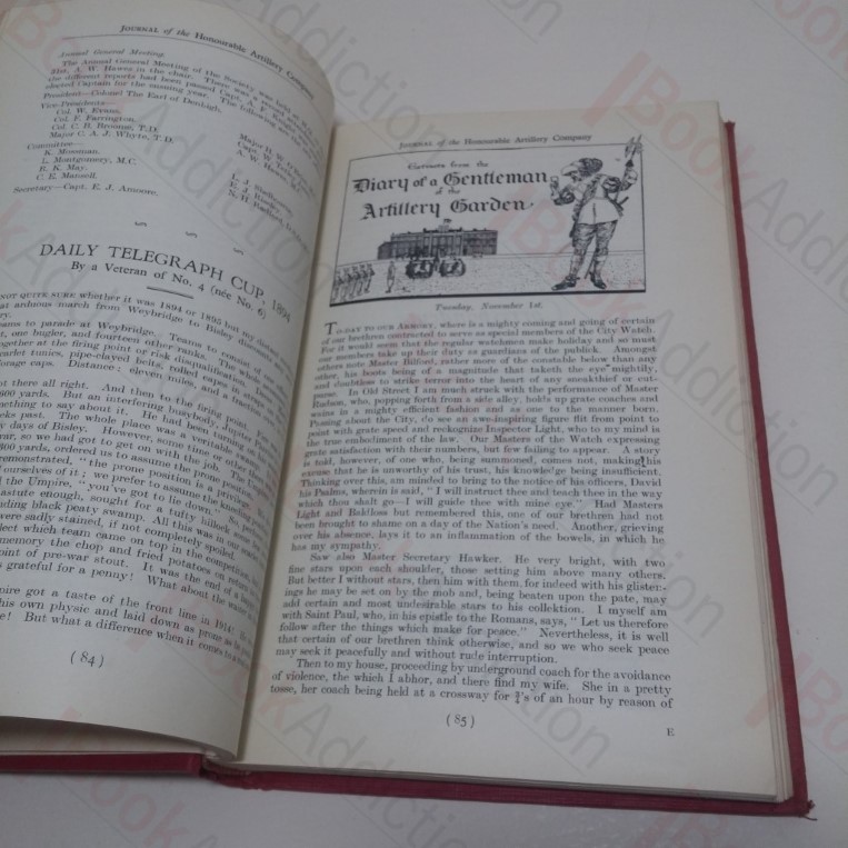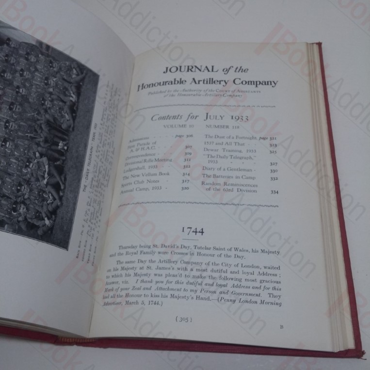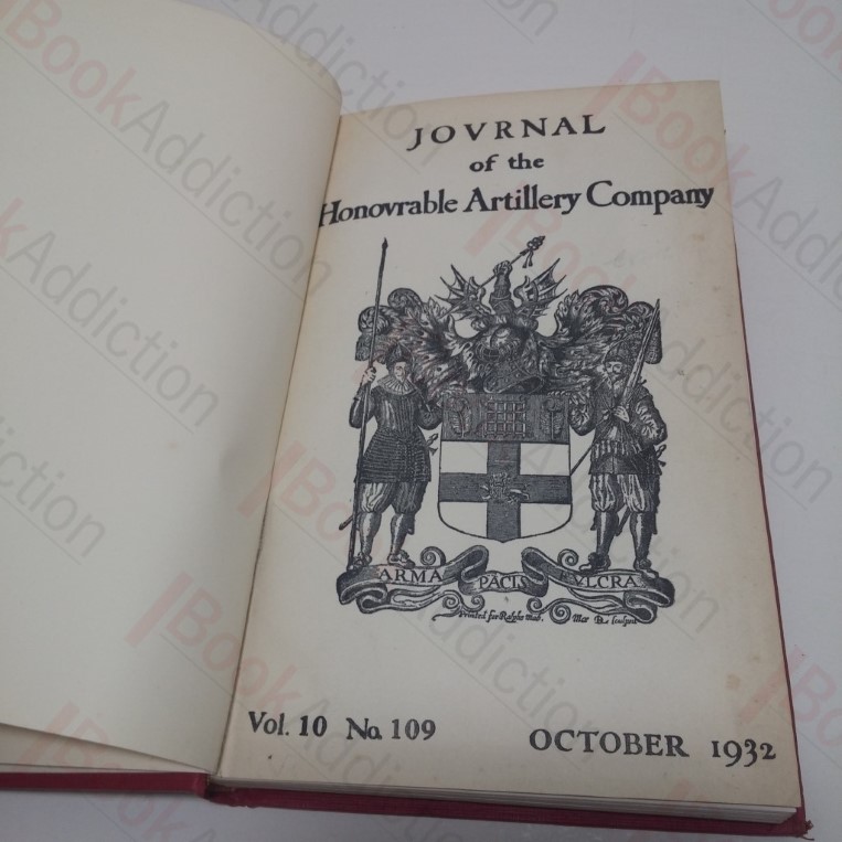 Twelve issues of the Journal of the Honourable Artillery Company (October 1932 to September 1933) bound in a single volume. [4], 408, 6pp, with illustrated additional title page, one tipped in, fold out coloured map, and many black and white illustrations throughout. In red cloth-covered boards with blind rules and gilt motif, gilt lettering on spine. Top edge gilt. 8vo. Cloth mildly sunned over spine, a little rubbed on corners, rounded at spine tips. Some mild spotting on prelims, else neat, clean, bright and tight throughout.