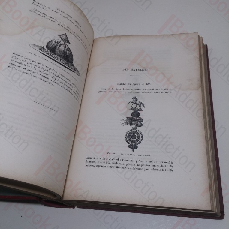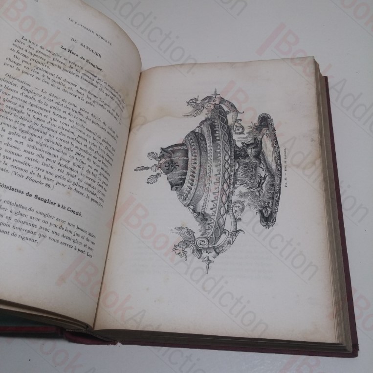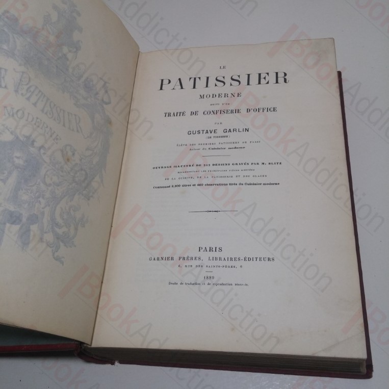 Text in French. Signed by Gustave Garlin, on verso of half title page, under a notice stating that any copy not bearing his signature will be considered counterfeit. xvi, 998pp, with 262 in text illustrations. In red buckram-covered boards with black lettering and decorations on front, spine and rear panel. Green endpapers. Tissue-guarded frontispiece. Large 4to. . Boards are severely discoloured and marked, rubbed all round edges, rounded on corners and spine ends, cloth cracked along length of rear joint. Text block edges dark and toned. Front pastedown is scuffed and scarred in upper leading corner, with some paper loss, front free endpaper chipped on leading edge, with some minor loss. The book has at some point had some water damage, now inert, and the first two thirds or so of pages show damp staining across their upper portions, with some associated discolouration in page margins. First dozen or so pages have flat crease along lower edge. Previous owner’s inscription, dated April 1930, inked on half title. Some minor spotting on tissue-guard, and light age toning to pages. This is not a pretty copy but it is complete, robustly bound and will serve well as a working/reference copy. It would also be a suitable candidate for rebinding or restoration. The companion volume to Garlin’s now classic Cuisinier Moderne. An important 19th century pastry treatise. Garlin (1838-1923) was one of the first, and one of the finest, great pastry chefs. A scarce edition of this classic work of French cuisine