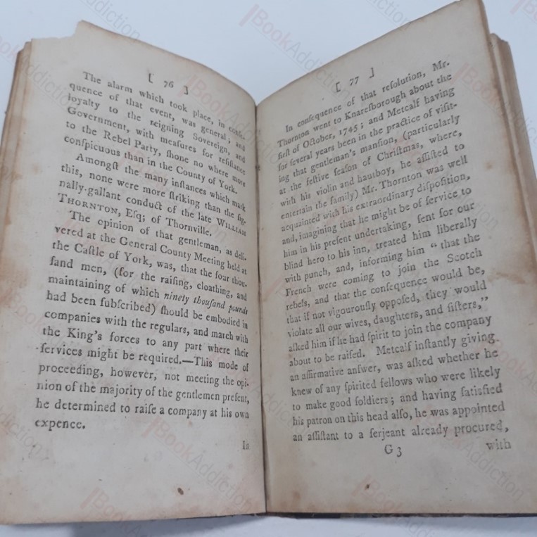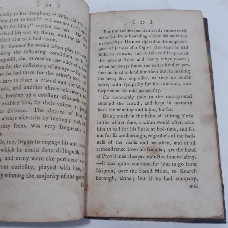 vi, 156pp. It what is likely a slightly later, early 19th century binding. Half leather over marbled boards, raised bands and red title label to spine. (Corners a little rounded, rubbed on spine joints and corners.) Gutter cracked between front endpapers. Previous owner’s name on verso of first page and on title page. Pages slightly toned, with finger marks on early pages. Some sporadic staining and spotting. Small holes in p 5. 12mo. Memoirs of English eccentric John Metcalf (1717-1810), blinded by smallpox as a child but lived an unusually active life riding, swimming, gambling, music, and long-distance walking. An innovative road-builder, he also raised troops against the 1745 Jacobite rebellion and was present at the battles of Falkirk and Culloden. ESTC T92160. 1st edition not in Boyne, who notes only the second and subsequent editions (Boyne, A Yorkshire Library, p. 246). Scarce.