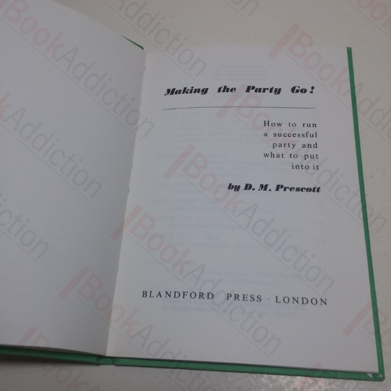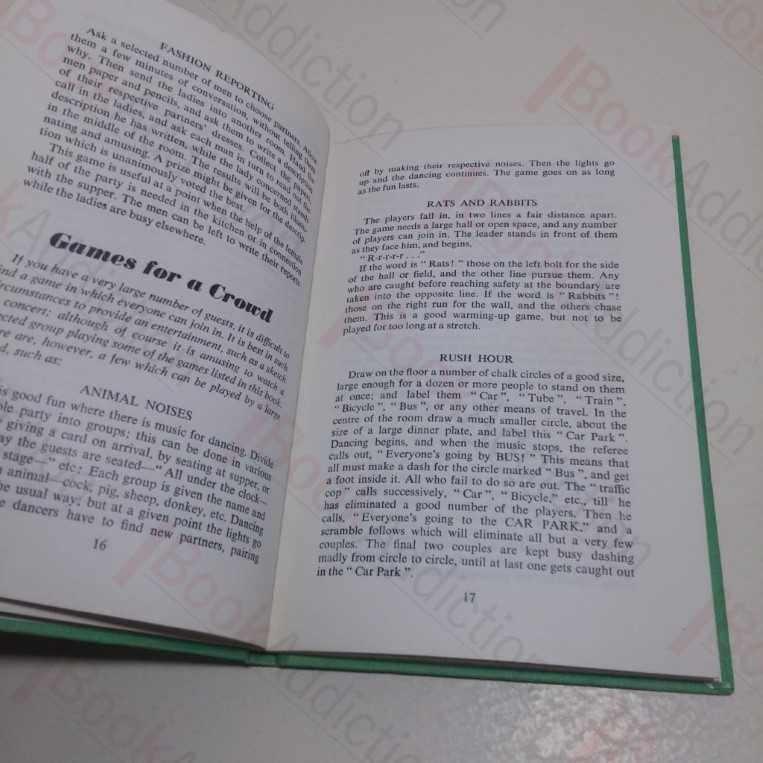 54pp. Green cloth-covered boards, black titles on front and spine. 12mo. Lightly bumped spine ends. A list of games is written on the last page “Write your own games here” page. Internally neat, clean, bright and tight. Includes 75 games and ideas on food, prizes, how to avoid awkward pauses etc.