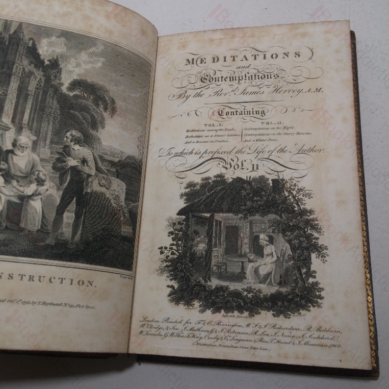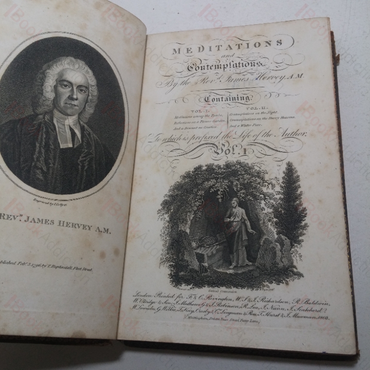 James Hervey (1714-1758) was an English writer and clergyman. Although influenced by Wesley and the Oxford Methodists, he remained a committed Calvinist. Mediations and Contemplations was his first published work, first appearing in 1746 with many further editions appearing in his lifetime. Said to be modelled on Robert Boyle’s Occasional Reflections on Various Subjects (1665) but Hervey’s style is more bombastic and revealing of both simple piety and a genuine appreciation of natural beauty.