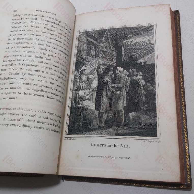 Complete in two volumes, volume one containing Mediations Among the Tombs; Reflections on a Flower Garden; and a Descant on Creation, and volume two containing Contemplations on the Night; Contemplations on the Starry Heavens and A Winter Piece. lxviii, 284pp; viii, 312pp, two engraved frontispieces, two engraved title pages and nine further engraved plates across both volumes. Bound in contemporary tree calf with gilt border decorations, black leather spine labels with gilt-stamped titles. All edges sprayed red. Marbled endpapers surrounded by gilt dentelles. 8vos. Boards are rubbed and scuffed, especially on edges and joint, with some minor leather loss at spine ends, rubbed right through on corners. Rear panel of volume to slightly loosened. Ex lending library volumes with bookplate and barcode on front endpapers, leading sheet and pocket on rear endpapers, minor annotations and small stamp on copyright pages (no other library markings). Previous owner’s (Charlotte Scott?) name stamped on page one of both volumes. There’s some spotting and foxing on the first and last few leaves of both volumes, and a little spotting on the rear of some of the plates else generally internally neat and clean.