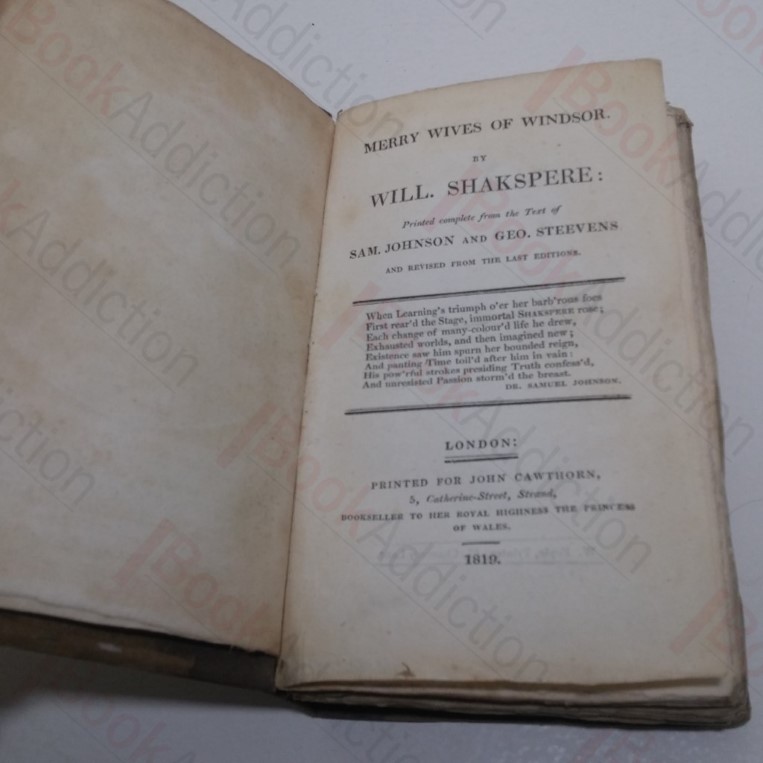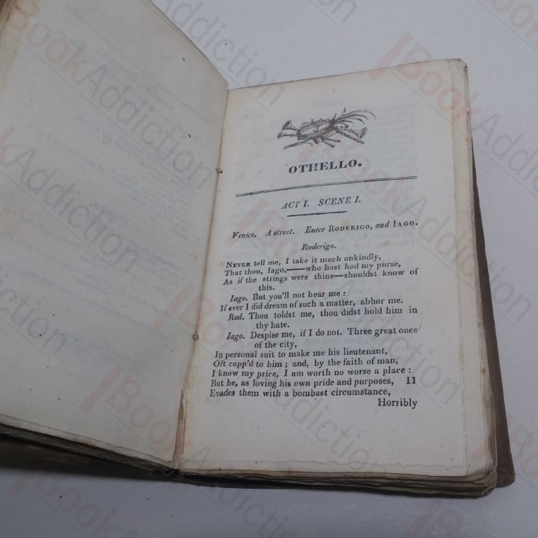 Three Shakespeare plays bound in one volume: The Merry Wives of Windsor (1819), Othello (1819) and Bell’s Edition of Midsummer Night’s Dream (1806). Merry Wives of Windsor preceded by two engraved illustrations, tissue-guarded. Quarter bound in pigskin over paper-covered boards. Paper title label on spine. Edges untrimmed. 16mo. Boards worn, rubbed at edges, rounded at corners, rear lower corner bumped, with some soiling. Spine leather scuffed at ends and creased. Spine label scuffed, creased and soiled. Front hinge cracked. Endpapers and prelims a little toned, some faint and occasional spotting but generally internally neat, clean and bright.