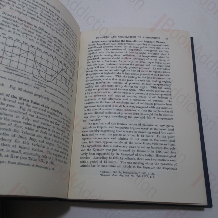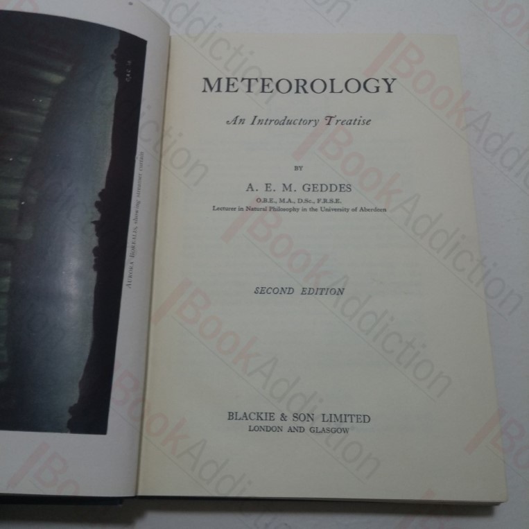 xx, 396pp. Blue cloth-covered boards, gilt titles on spine. Bumped spine ends, cloth wearing. Text block edges starting to tan. Endpapers tanning, evidence of tape from a previous protective wrapper. Internally neat, clean, bright and tight. No dust jacket. 8vo. Second edition written with the view of explaining to the many classes of the community to whom the weather conditions are of the utmost importance; the aviator, the farmer, the sailor, and even the holiday-maker. Published to War Economy Standard.