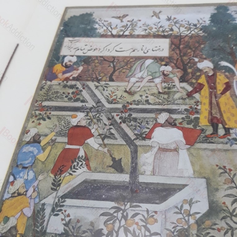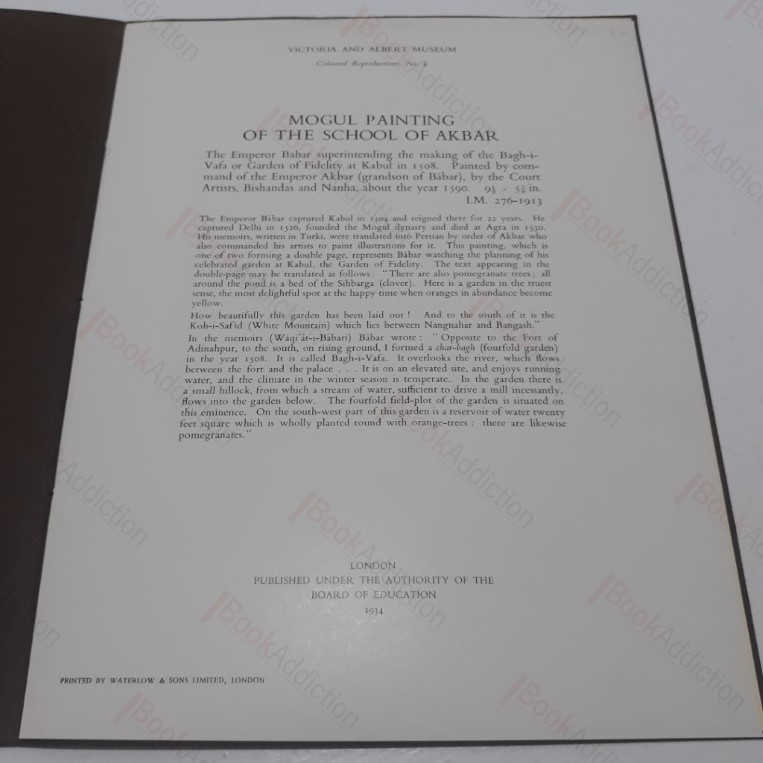 Unpaginated, 4pp, stunning single full colour plate. Brown card covers, beige label with black titles. Some scratches and sun fading on front. Lender’s label on verso of front cover. 4to. Coloured Reproductions series, No. 9. With brief notes explain how the painting tells the story of Emperor Babar and his capture of Kabul in 1504.
