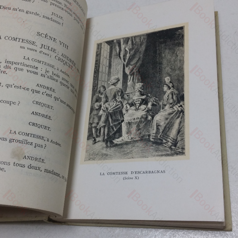 Text in French.  Undated but circa 1915.  Volume six (of six) only from Nelson’s Lutetia edition of the complete works of Moliere.  476, [4]pp, with a monochrome plate frontispiece.  Cream cloth-covered boards with gilt lettering and decoration.  Illustrated endpapers.  16mo.  Cloth boards are a little toned at edges and along joints gently rounded at corners and  spine ends.  A little browning and spotting to text block edges. Previous owner’s name neatly inked on strip  toned endpapers, very occasional spotting and very mild toning internally, with the occasional sign of handling.  In its original dust wrapper, a little toned, especially over spine,  scuffed and rubbed and a little chapped on edges. The original pricing has been over-labelled on both the front panel and the spine: the label on the spine is chipped and faded, that on the upper panel is scuffed with some loss.