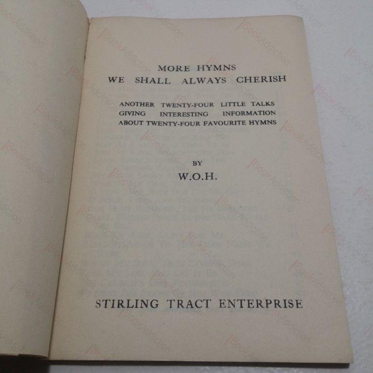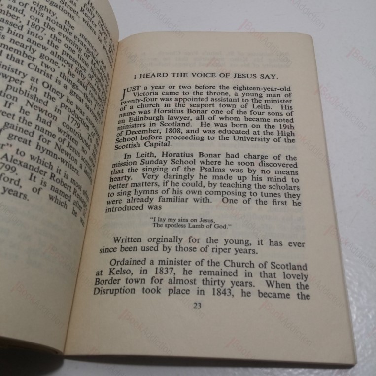 54pp. Printed heavy paper covers, flaps. Spine torn at ends, chipping to edges. Pages tanning. Internally neat, clean and tight. 12mo. More little talks giving interesting information about twenty-four favourite hymns including Abide with Me, All Hail the Power of Jesus’ Name, God Moves in a Mysterious Way, Guide Me Oh Thy Great Jehovah, Rock of Ages etc.