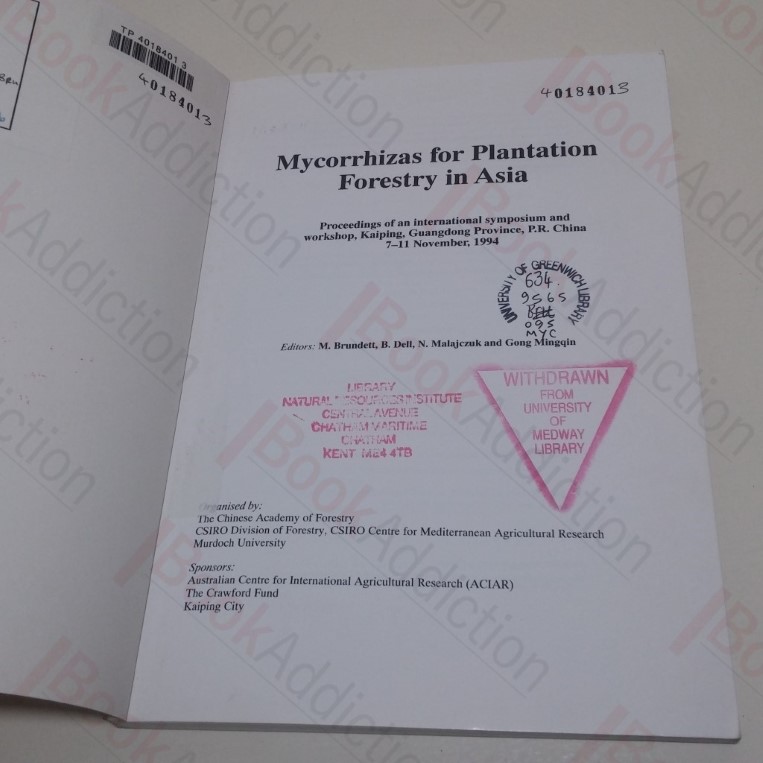 146pp, with in text with diagrams, graphs and tables. Pictorial light card covers, black and green titles on front, black titles on spine. 8vo. Lightly bumped spine ends, shelf number on spine label, light shelf wear to covers, corners lightly curled. Lender’s rubber stamp at top of front cover, security devices, stamps and markings on endpapers and copyright page, else internally neat, clean, bright and tight. A set of conference papers on: the Occurrence and Ecology of Mycorrhizal Fungi and Associated Plants; the Physiology and Ecology of Mycorrhizal Associations, and Management of Mycorrhizas Associations in the Nursery and Field.