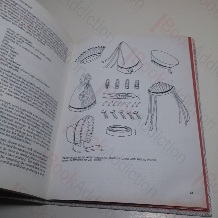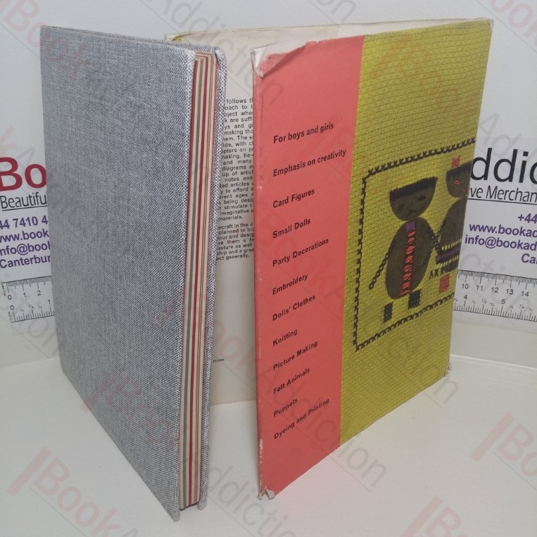 128pp, line drawings throughout. Gray cloth-covered boards with red titles to spine. 4to. Spine ends rubbed and rounded. Slight wear to top and bottom board edges. Corners lightly rubbed and rounded. Small mark to rear board. Boards cupped. Peach coloured endpapers. Internally there are sections of blue, red and orange pages. Pages 69-72 stained red due to water damage and bleed from red pages, does not affect text. Otherwise this is a neat, clean, bright and tight volume. Illustrated paper dust jacket. Light fading to spine, wear to top and bottom of spine, mirrors book damage. Paper is rippled on rear, not price clipped. This is a beautifully illustrated book with diagrams and patterns throughout. The scope of the book is very wide, with clearly illustrated chapters on party decorations, picture making, tie-dyeing, puppets and many more projects, helping the teacher to stimulate the children’s creative interest in fabrics and other materials.