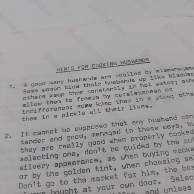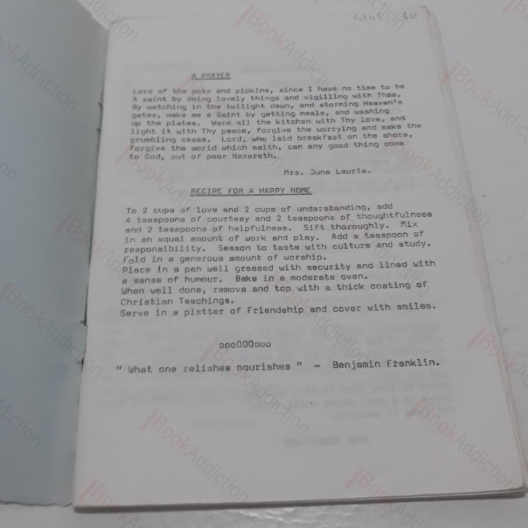70pp. Light blue paper covers, printed design and titles in black. Small tears and fold on both covers, worn at edges. Internally neat, clean, bright and tight. Has the appearance of being printed for limited circulation, perhaps among friends and family. A super collection of traditional recipes, including many for sweets and desserts, recipes for happy homes etc. Comfort food. Humourous last page on ‘Hints for Cooking Husbands’. Recipes include cucumber soup, melting moments, tablet, various versions of fish pie, tiffin, tea bread etc.