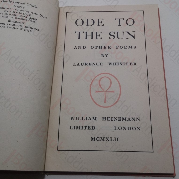 56pp. Red cloth-covered boards, gilt titles on spine. Lightly bumped spine ends. Boards heavily mottled. Signed and inscribed by author on front free endpaper, ‘J.W. Dunne with my admiration January 1945 Laurence Whistler’. Internally neat, clean, bright and tight. Dust jacket has some shelf wear, chipping to edges, mirrors book damage, price unclipped. 8vo. A new collection of poems produced to War Economy Standard.