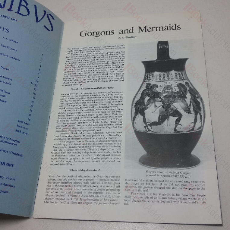 Three issues of Omnibus, the journal of the JACT (Joint Association of Classical Teachers), Issue Three from March 1982; Issue Four from November 1982; and Issue Five from March 1983. 32pp stapled booklets with black and white illustrations in stiff card covers. 4to. Covers have a little gentle edge wear and are unevenly faded around margins and over spines. Internally a few minor signs of handling else neat, clean, bright and tight. Issue five has a crease to the front cover.