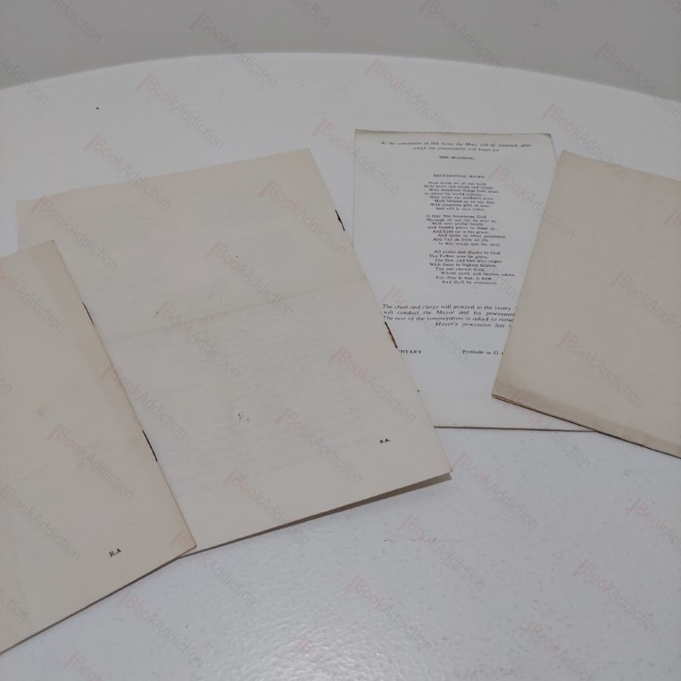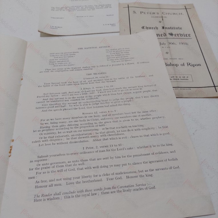 A collection of four Orders of Service for special services at St Peter’s Church in Harrogate. The first is for a service which took place upon the 117th Meeting of the British Medical Association on 28 June 1949 (a few small pencil notes). This service was broadcast on the BBC. The second, a 8pp stapled booklet is the Form of Service and Hymns for a service on the eve of the Coronation of Queen Elizabeth Second on 1 June 1953 (mild oxidization around staples, else very nice and clean). The third is for a Church Institute Combined Service, 8pp stapled booklet, on 30 July 1910 with the Lord Bishop of Ripon as the preacher (covers slightly toned at edges, mild oxidization around staples and signs that the booklet has at one point been folded). The fourth is for a Civic Service held on 6 June 1971, 8pp stapled booklet (slight foxing on covers, oxidization around staples and a little bumped at edges).