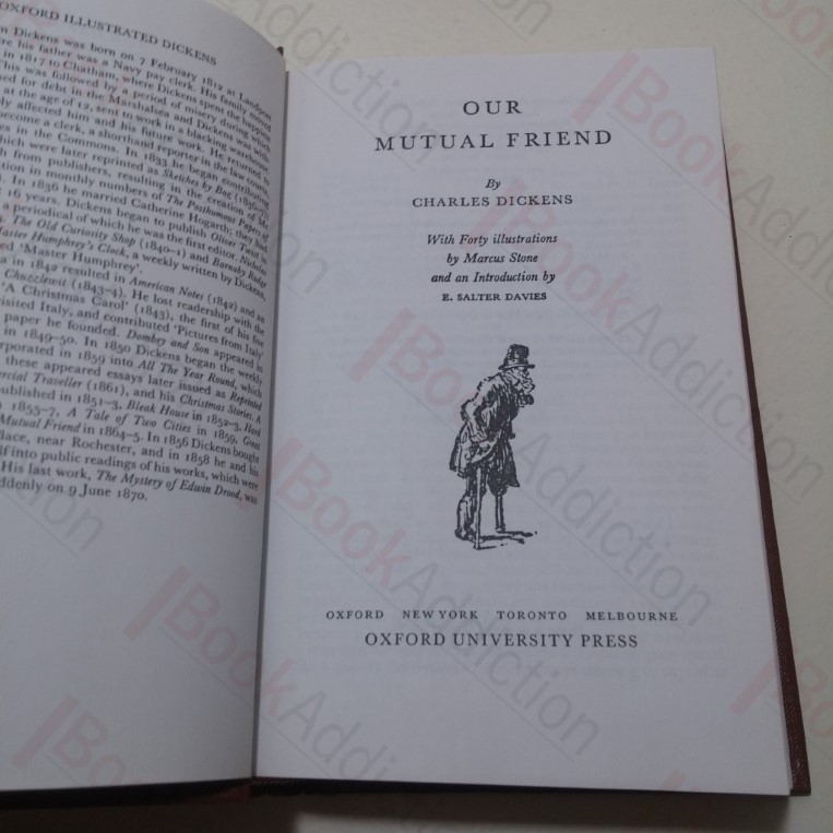 xxviii, 822pp, with forty illustrations. In brown cloth-covered boards with gilt lettering on spine. In its original illustrated dust jacket (very slightly sunned spine, very slightly bumped at edges). 12mo. The Oxford Illustrated Dickens (known as the New Oxford Illustrated Dickens prior to 1966) is a comprehensively illustrated complete set o Dickens work. Each volume includes up to seventy-six early engravings, many of which appeared in the first editions of these works. The text is derived from the Charles Dickens Edition, revised by the author in the 1860s. A pleasing, collectible set of books, we have many volumes from the Oxford Illustrated Dickens in stock and offer generous discounts to those order more than one volume at a time – please inquire.