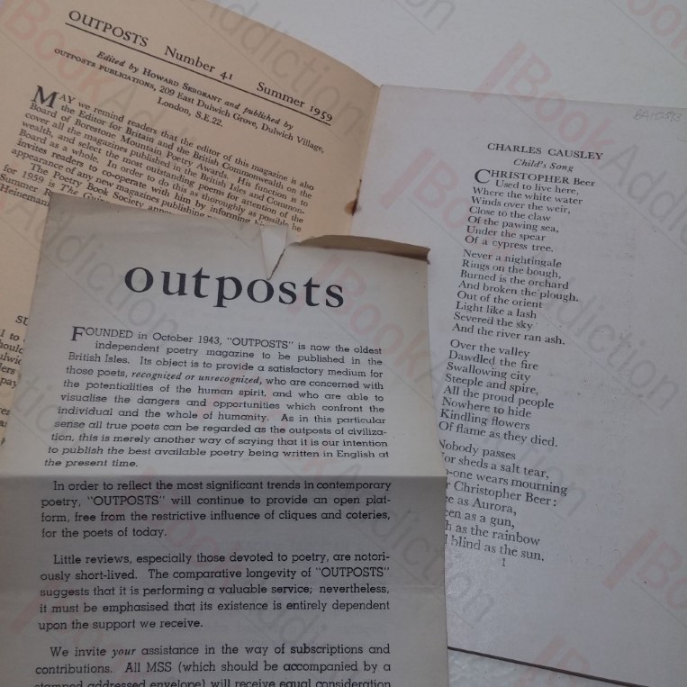 24pp stapled booklet in stiff card covers (covers a little worn, oxidising around staples). Internally, some mild toning and occasional spotting to pages. A 4pp flyer promoting Outposts, and giving a little of the history of the journal, loosely laid in (chapped along top edge). 8vo. Contributors to this issue include Kenneth Gee, Peter L Sissons, Bernice Ames, Edwin Brock, Franics Berry and many more. Outposts, for many years edited by Howard Sergeant until his death in 1987, is the oldest independent poetry magazine to be published in the British Isles. Early numbers, such as this, are quite hard to find.