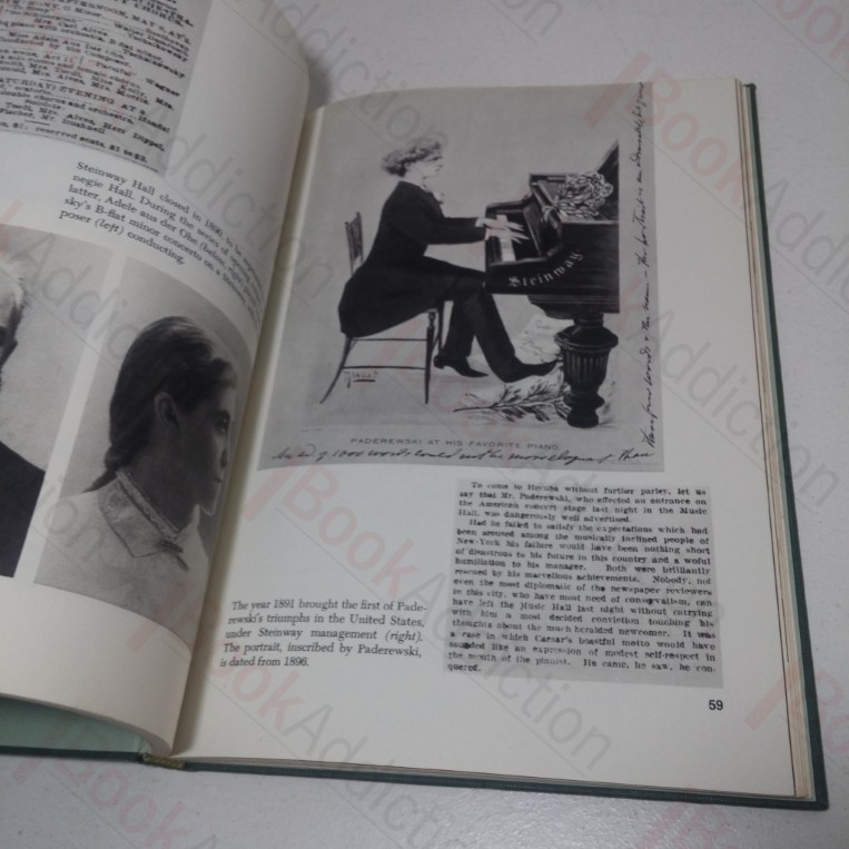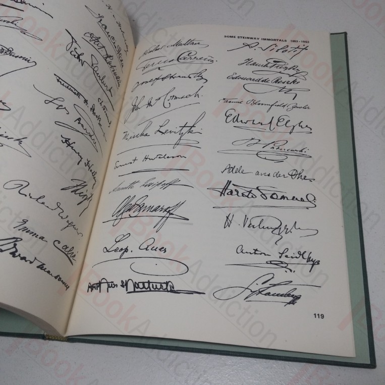 122pp, in-text black and white photographs and signatures. Green cloth-covered boards; gilt design on front, gilt titles on front and spine, green endpapers. 4to. Sun-faded bottom board edges, rubbed spine ends. Text block edges starting to tan. Previous owner’s name on front pastedown Otherwise, internally neat, clean, bright and tight. Dust jacket tanning, has several closed tears (some with internal tape repairs), minor loss, shelf wear, chipping to edges, mirrors book damage. Reprint of the ‘Coronet Tells the Story of Steinway’ double fold-out A5 sized loosely laid-in.