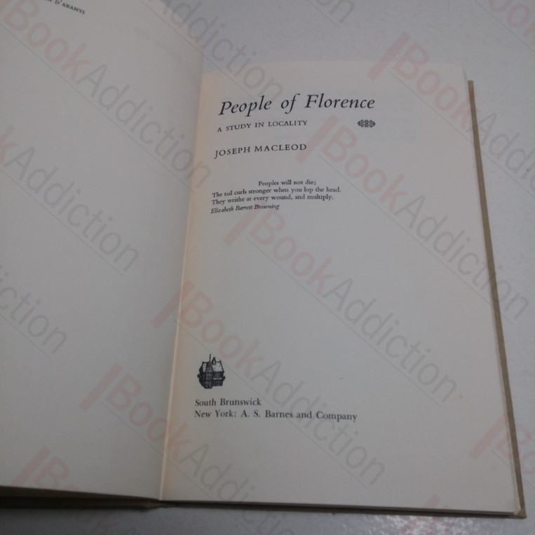 252pp, including maps of Florence. In greenish-beige cloth-covered boards. Boards gently rubbed and rounded at corners and spine ends, small rip in cloth at base of spine. Text block edges very slightly foxed, else neat, clean, bright and tight throughout. In its original worn and edge-chipped dust jacket with minor loss at base of spine and a couple of short, closed tears at corners. Neither a guide book or a social history – although it serves well as both – People of Florence is a portrait of a city and its people which has not greatly changed over 600 years. art, Architecture, flowers, trees, song birds, theatre, food and drink, public ceremonies and games, its all here, and the sober reader will also find thought in relation to the individual liberties of Florence and the bureaucratic controls of the Government in Rome.