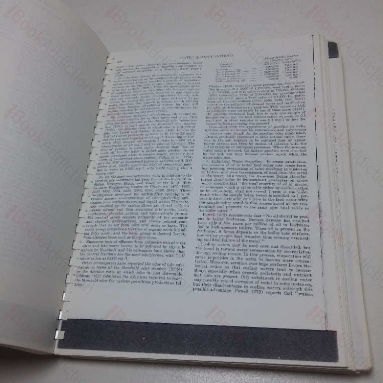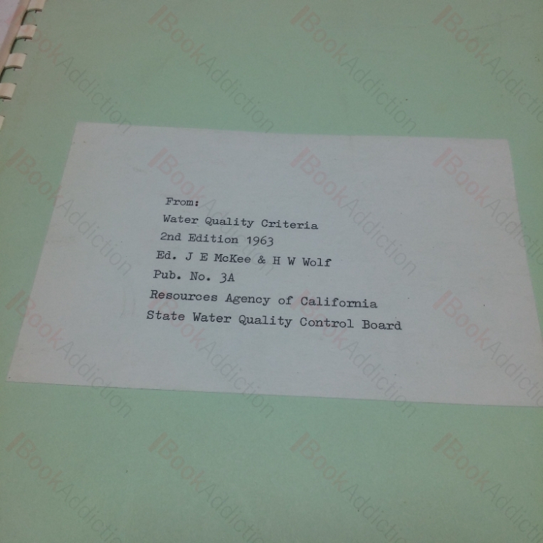 Single sided photostat copy of Chapter Six – Potential Pollutants and Appendix G, US Public Health Service Recommended Sanitary Requirements for Waster Treatment Systems of the 1963 report of on Water Quality Criteria from the Californian State Water Board (a compendious reference work). Chapters IX (Pesticides) and X Surface Active Agents) also loosely laid in.