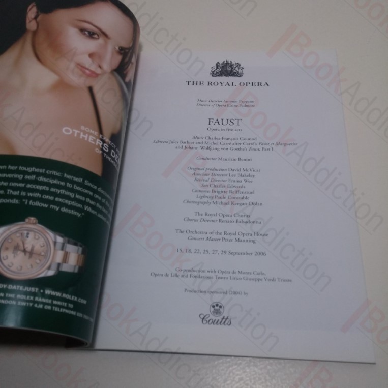 48pp, numerous pages of ads, bios, introductions. Illustrated with black and white & colour photographs. Pictorial light card covers. Light chipping to edges and wear to covers. Internally, neat, clean, bright and tight. 8vo. Programme for the opera held at the Royal Opera House, in September 2006 with Piotr Beczala as Faust, Orlin Anastassov as Mephistopheles, Angela Gheorghiu as Marguerite, Robert Gleadow as Wagner, Russel Braun as Valentin, Christine Rice as Siebel and Della Jones as Marthe Schwertlein. A very good clean copy.
