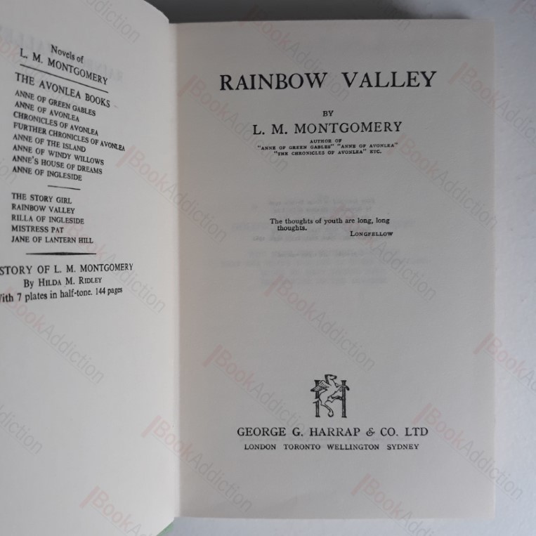 Three uniform, vintage volumes of L M Montgomery’s classic children’s tales. The Rainbow Valley (1962, 342pp, green cloth boards neat and clean, gently rounded at spine ends, previous owner’s inscription on flyleaf else internally neat, clean, bright and tight, in its original dust jacket, a little rubbed and chipped at spine ends, small scuff on spine); Mistress Pat (1956, 348pp, gently worn green cloth boards, internally neat, clean, bright and tight barring occasional spotting, in its original dust jacket, rubbed at scuffed at edges, faded along spine); The Golden Age (1934, 286pp, dark green cloth boards gently rubbed at corners and spine edges, internally neat, clean, bright and tight barring occasional spotting, in its original dus jacket, chapped at edges with minor loss, heavily sunned on spine, scattered small creases). A lovely, period set, designed to add to the pleasure of reading, from the author of Anne of Green Gables. All dust jackets now protected in archival quality mylar wrapper, fitted without adhesion to the volume or jacket. A large set which may require an additional charge for delivery outside the UK.
