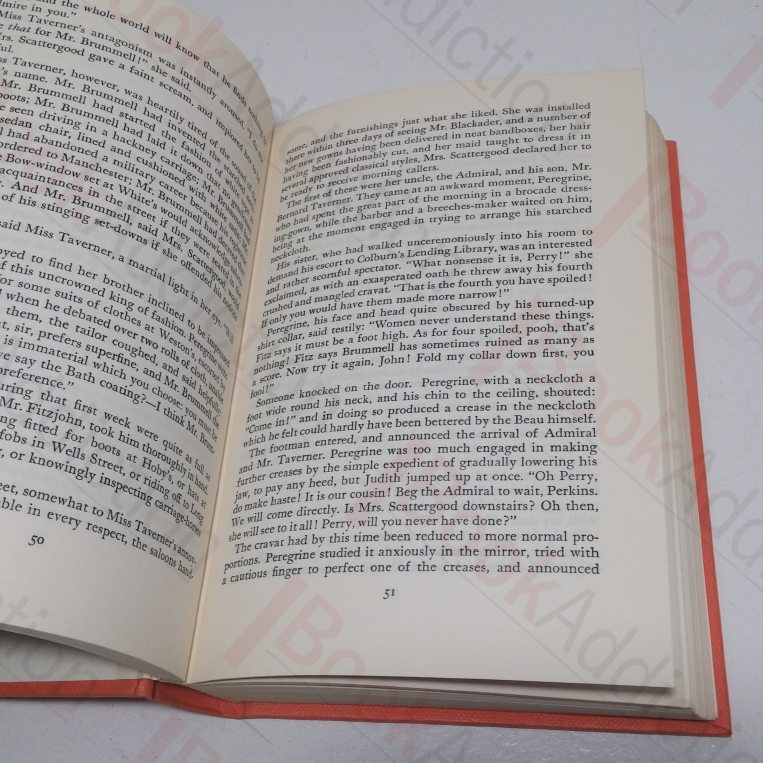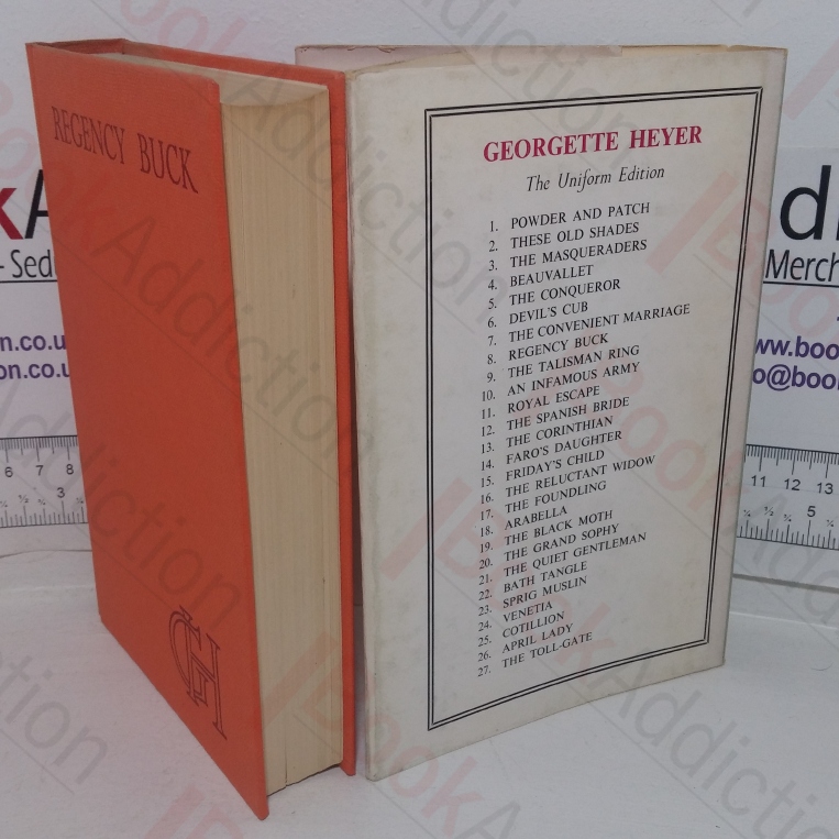 Uniform edition of the Novels of Georgette Heyer. Reprint. 334pp. In orange cloth-covered boards with red titles front and spine. 8vo. Cloth slightly pushed at spine ends. Hint of dustiness to top page block edge. Internally neat, clean, bright and tight. Original pictorial dust wrapper, price clipped, gently bumped on extreme edges, small rub on fore edge, very slight shelf wear visible on verso. Dust wrapper now protected in an archival-quality Mylar wrapper, fitted without the use of tape or adhesives.