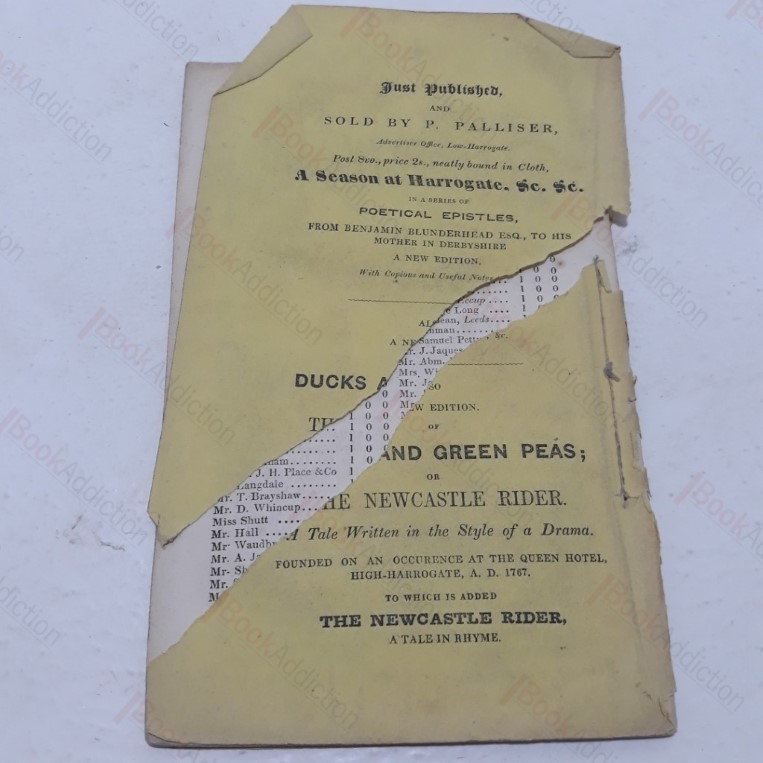 24pp booklet with stitched binding and printed paper covers (covers heavily worn, chapped along spine, mildly soiled and faded; two thirds of the rear cover is detached, but laid in). Small engraving, showing a view of the sulphur wells in question, bound in. Internally neat and clean barring some page toning and wear at page edges. Reports on the 1837 trial of Joseph Thackwray who, it was alleged, tried to divert the spa waters of Harrogate for his own purposes, with a collection of the affidavits made by other local people to trial . A rare survival from the time, now very hard to find. Small, slim 8vo.