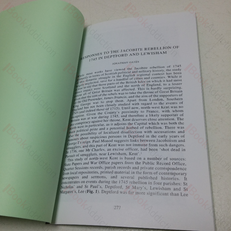 An academic off print from the Archaeologia Cantiana, Volume 170, 2000, containing the full article on responses to the Jacobite Rebellion in Deptford and Lewisham. pp. 277-295, including some black and white illustrations. Plainly bound in light card covers, with title label in upper leading corner. 8vo. Slight fading to card covers else neat, clean, bright and tight.