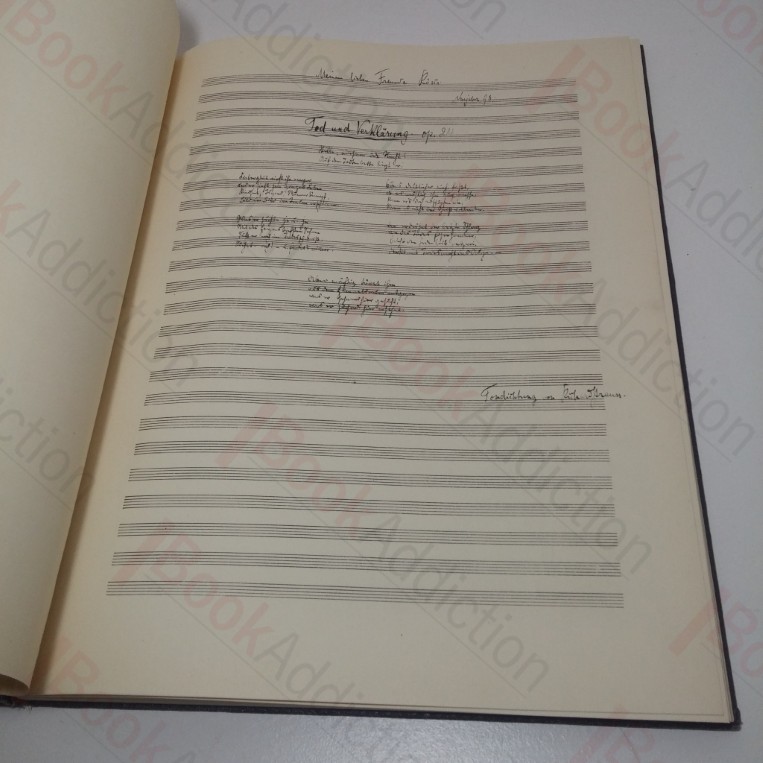 A handsome facsimile reproduction of the orchestra score, including original notes and annotations, for Strauss’s work, Tod and Verklarung, completed in 1889.
