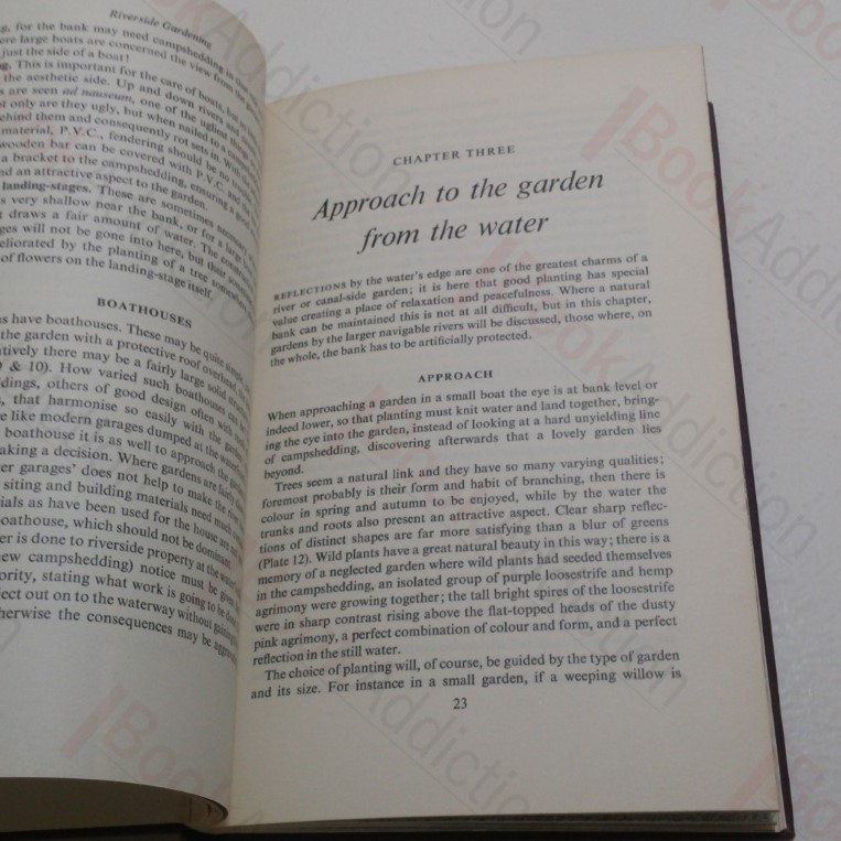 112pp plus numerous black and white plate illustrations, line drawings in text. In brown cloth boards with gilt lettering (boards are strong, fresh and clean edged). Internally, pages a little off-white, else neat, clean and tidy. In its original dust jacket (a little bumped and rubbed at edges). This volume deals with the distinctiveness of water-side gardening, including protecting against erosion and flooding, and providing extensive planting inspiration for gardens and water-meadows. There’s also a chapter on window boxes, tubs and hanging baskets for houseboats and river-side houses.