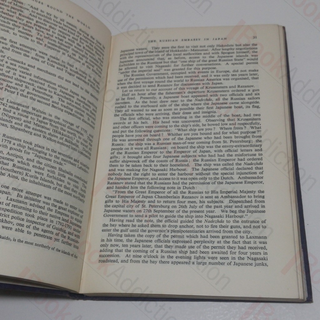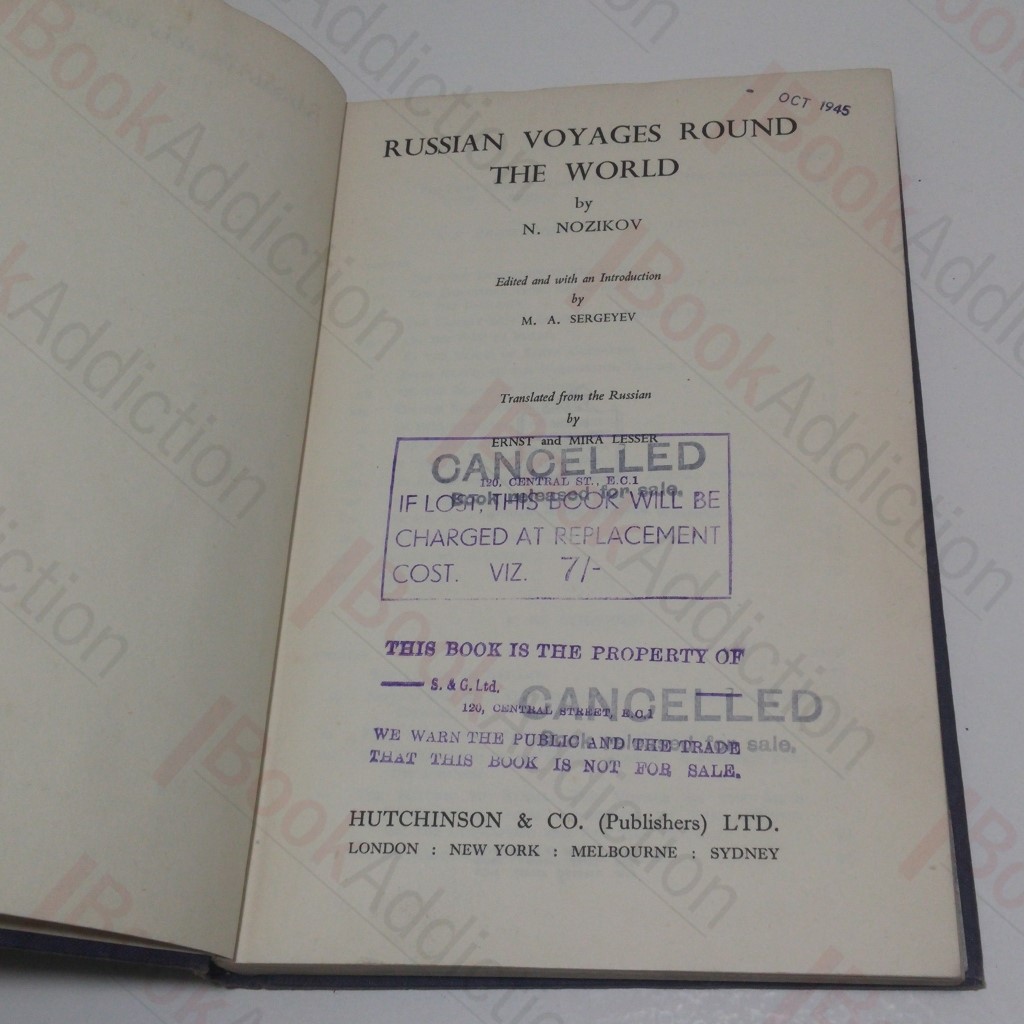 Undated, but volume produced to war economy standards, suggesting publication in the 1940s. 166pp, maps on endpapers. Brown cloth-covered boards with gilt titles on spine. 8vo. Cloth is worn and marked, sunned over spine with titles faded, a little rubbed and rounded at corners and spine tips. Text block edges slightly toned. An ex-lending library copy with the usual, heavy, marking, and cancellation stamp. Internally pages show some signs of reading and are a little creamy with occasional marks. A good strong reading copy but less than pretty in appearance. Translated from the original Russian into English by Ernst and Mira Lesser, introduction by M A Serfeyev. A history of Russia expeditions to sail around the world