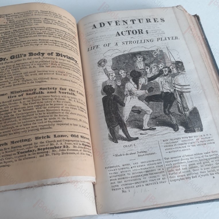 1837-1839. A collection of periodical magazines from 1837 to 1839, bound together in cloth-covered boards (boards worn, rubbed at edges, cracked around spine and front board almost wholly detached). The periodicals themselves are in good condition, with a little age toning and edge wear. Around 30 periodicals, some literary, some political and some church related but most board-brush, sometime satirical, stories, anecdotes and pen portraits. Examples include the first issue of Streetology; Clarke’s Tales of the War; The Political Mirror, The Cabinet; The Enquirer; The Penny Pickwick; The Pickwick Songster; Wilson’s Wonderful Characters; The Protestant Preacher; The Sketch-Book by Bos; Cockney Adventures; Tales of Chivalry; Adventures of the Actor; Holt’s Circulating Library; The National, a Library for the People etc. There is a handwritten table of contents at the front. Two of the periodicals contain accounts of Miss Whitehead, the Black Nun of Threadneedle Street, one of which purports to be an obituary of sorts. A large and heavy volume which will likely incur an additional charge for overseas delivery