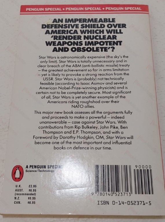 166pp plus publisher’s adverts at rear. Laminated soft card covers (a little edge wear). Internally neat, clean, bright and tight barring a tad of toning. A collection of essays and articles which assess the arguments for and against the Star Wars programme of the 1980s. amounting to a full and powerful case against Star Wars and finding it in breach of the Anti-Ballistic Missile Treaty and contrary to the interests of the USA’s NATO allies.