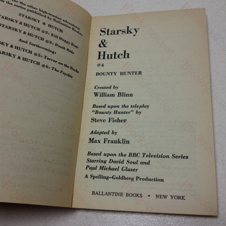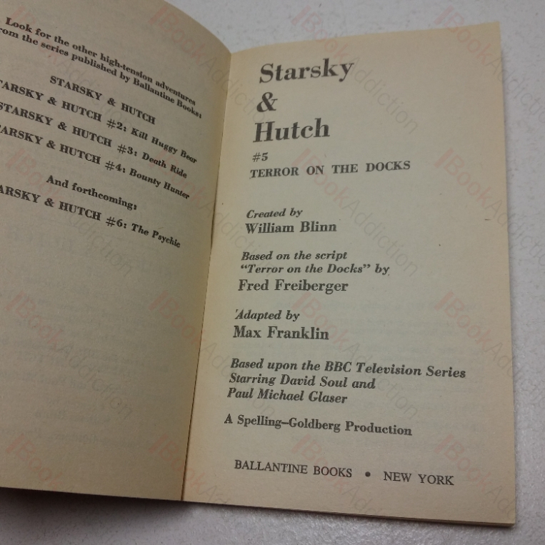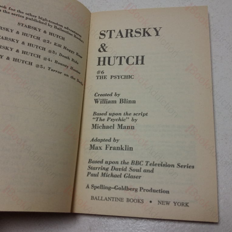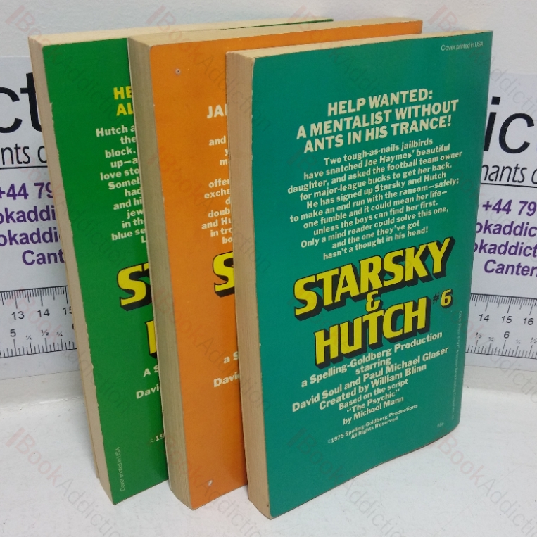 A collection of three vintage Starsky and Hutch paperbacks, all published by Ballantine Books, all 12mo. (1) Starsky & Hutch #, Bounty Hunter, 1st Special Printing, 1977, gentle rubbed to edges and spine folds, previous owner’s bookplate inside front cover else neat, clean, bright and tight. (2) Starsky & Hutch #5, Terror on the Docks, 1st this, 1977, gentle edge wear to card covers, previous owner’s nae inside front cover, else neat, clean, bright and tight. (3) Starsky & Hutch #6, The Psychic , 1st Special Printing, 1977, mild reading crease on front fold, previous owner’s bookplate inside front cover else neat, clean, bright and tight.
