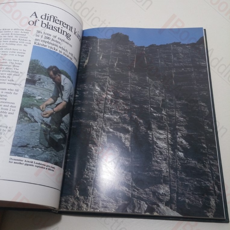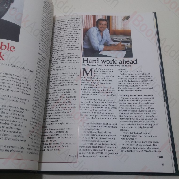 136pp. Green/black vinyl-covered boards, silver titles on spine. 4to. Top text block tanning, affects page margins. Internally neat, clean, bright and tight. Dust jacket has 3cm closed tear top of rear, red blemish on rear, shelf wear and chipping to edges. Consists of articles, reports and interviews formerly printed in Statoil’s quarterly magazine and in the Karsto-avisa, both published by Statoil.