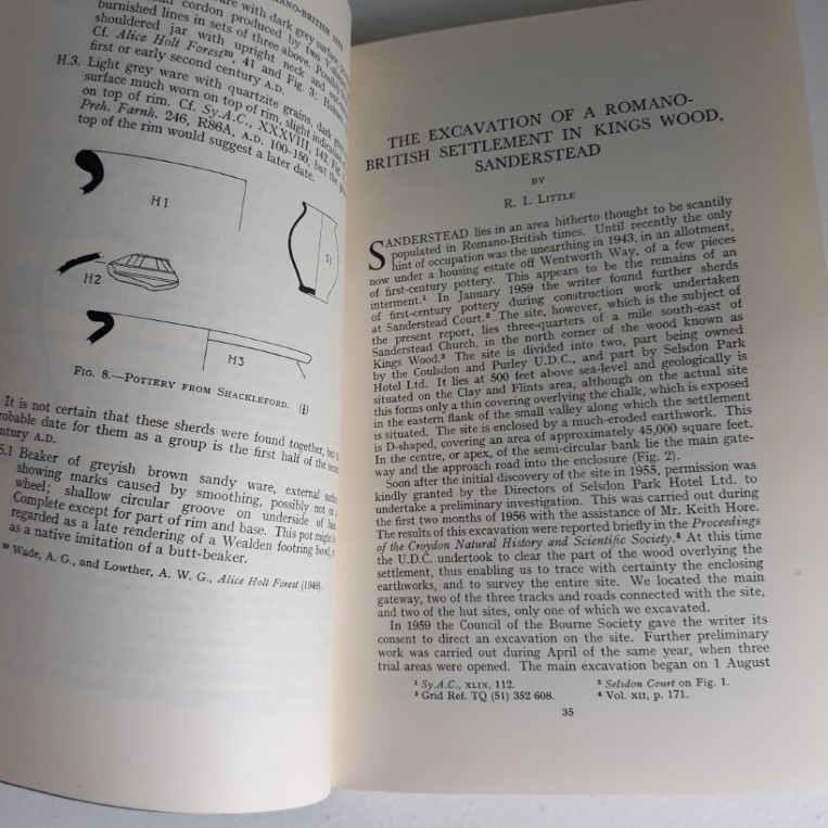 xii, 128pp. Black and white illustrations, maps, charts etc. Indexed. Neat and clean copy – very gentle edge wear. Some small white marks on covers and small scuff at base of spine Collection of detailed essays of aspects of the history of Surrey, including articles on Nonsuch Palace; a Roman site at Charterhouse, Godalming; Excavation at Romano-British settlement at Kings Wood, Sanderstead; History of the Thames Bridges between Hampton Court and East Moseley; Excavation of Two Mounds on Thursley Common; and Excavation of a Mound in Weston Wood, Albury