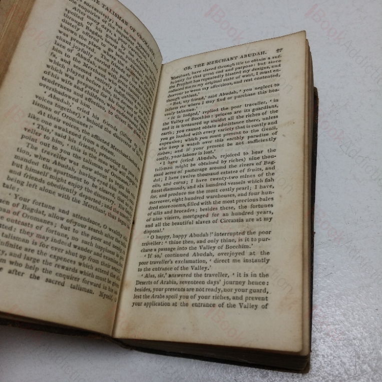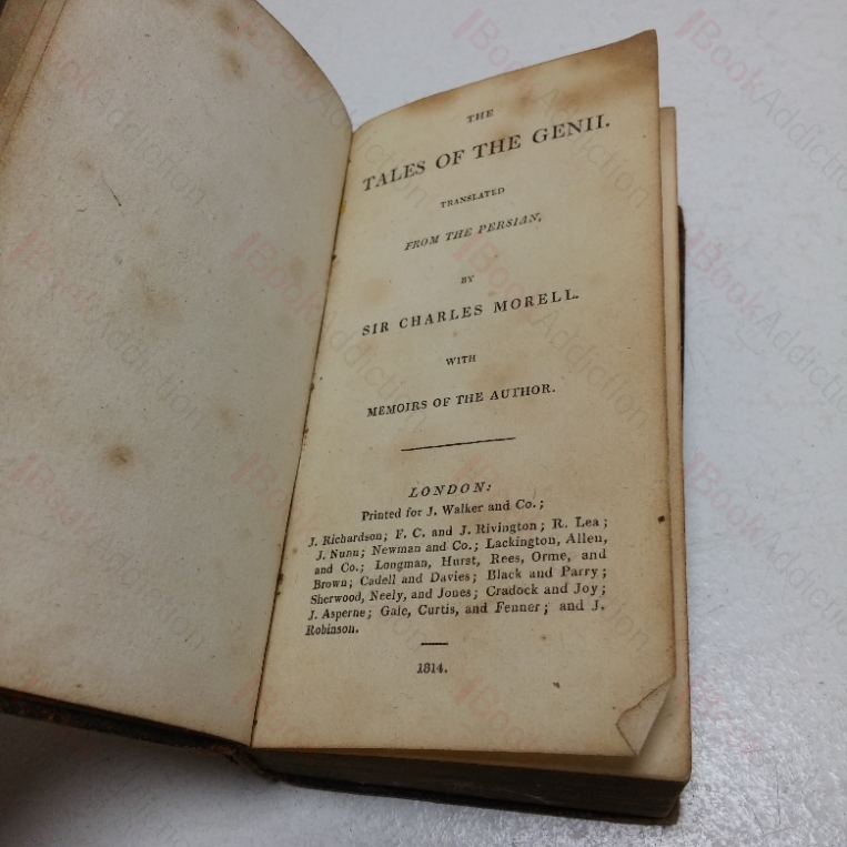 The Tales of the Genii, first published in two volumes in 1764, is a collection of Oriental-style pastiche fantasy tales isimilar to the better-known The Arabian Nights. The work purported to be a translation of an authentic text by a Persian Iman, Horam, translated into English by Sir Charles Morell, ‘formerly ambassador from the British Settlements in India to the Great Mogul’. It was in fact almost entirely the work of the English chaplain and author James Ridley (1736-65). Ridley’s book was commercially successful and popular. This sixth edition was publsihed after Ridley had been recognised as the originator and includes a brief memoir of Ridley not present in some earlier editions, It was the last early 19th century edition: two further editions were produced later in the 19th century, in 1849 and 1861, but were revised, ‘purified and remodelled…with a vuew of developing a religious moral’ by Richard Whately, Archbishop of Dublin and are widely considered inferior. Despite dwindling popularity, Ridley’s tales remained culturally influential: Charles Dickens’ juvenile play. Misnar, is based on the sixth tale, and the collection’s influence on Coleridge’s Kubla Khan has been remarked upon..