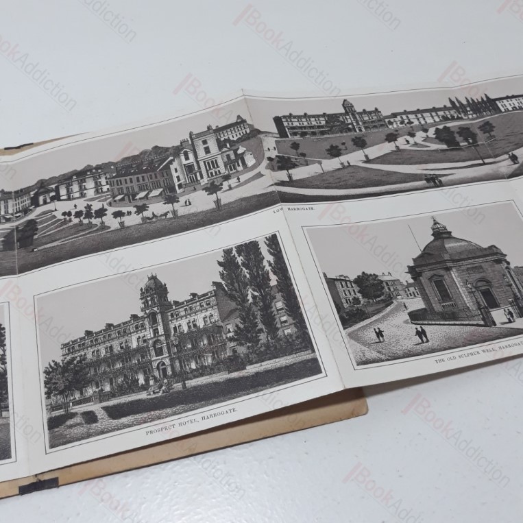 Not dated but internal evidence suggests c 1890-1900. A selection of etched and engraved panoramic and single perspective views of Harrogate, presented on a single fold out which extends to c. 66 inches, in red card covers with linen backstrip gilt lettering and decoration (card covers a little worn at edges, minor cracks on interior joint, with some light soiling, internally images are clean and bright, with just a little rubbing on folds). Images include Low Harrogate, Royal Spa Concert Rooms and George Hotel, The Park and Regents Parades, Fountains Abbey, Brimham Rocks, Pateley Bridge, Knaresborough Castle etc. Tall 12mo.