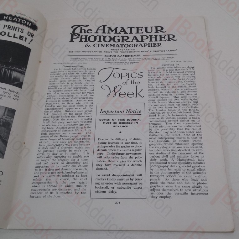 8pp period adverts, 271-290pp, 9-20pp period adverts. Colour paper cover, stapled; black and white photographs throughout. 4to. Staples starting to oxidise, cover very lightly soiled at edges. Corners curling. Internally neat, clean, bright and tight. The Journal for everybody with a camera, dated Wednesday, September 13th 1939.