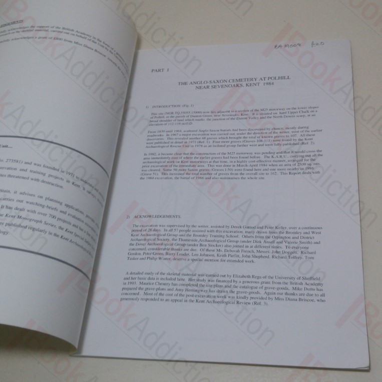 36pp, with black and white illustrations. In illustrated, laminated card covers, stapled. Tall 4to. Card covers a little rubbed on corners, slightly faded over spine. Internally neat, clean, bright and tight. From the mid 19th century to the 1960s, scattered Anglo-saxon burials were discovered by chance on the lower slopes of Polhill, in the parish on Dunton Green, near Sevenoaks. In 1967 an excavation was carried out, revealing a further 68 graves. In 1982 it became clear that the construction of the M25 motorway would affect the site and further rescue archaeology was carried out, finding some further 50 graves. This report explains and records the findings of both those excavations.