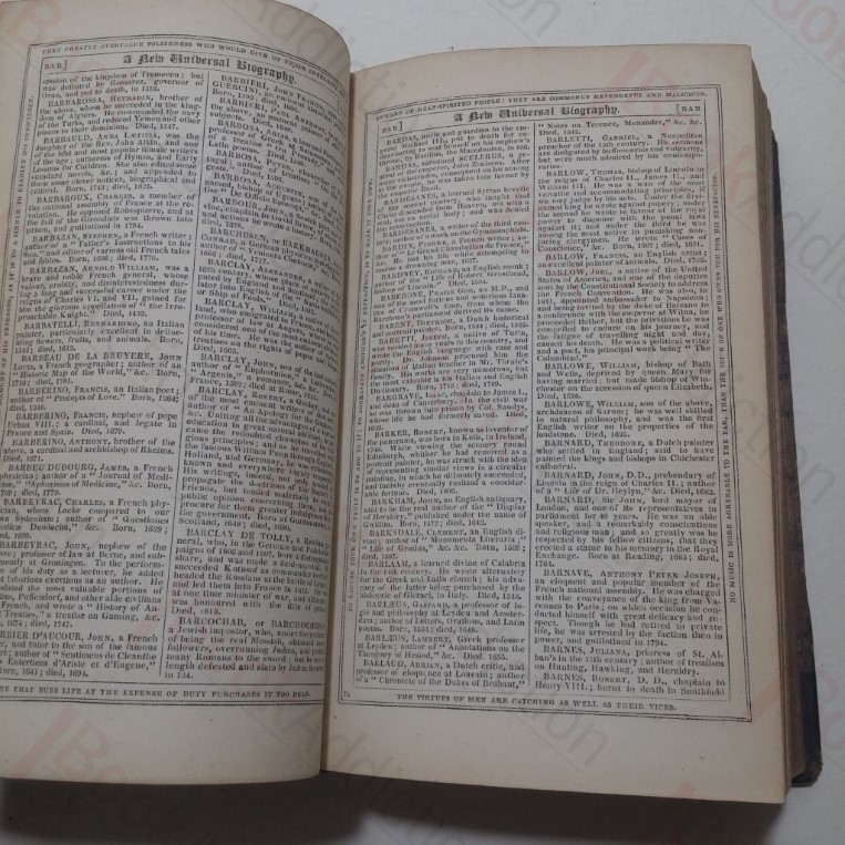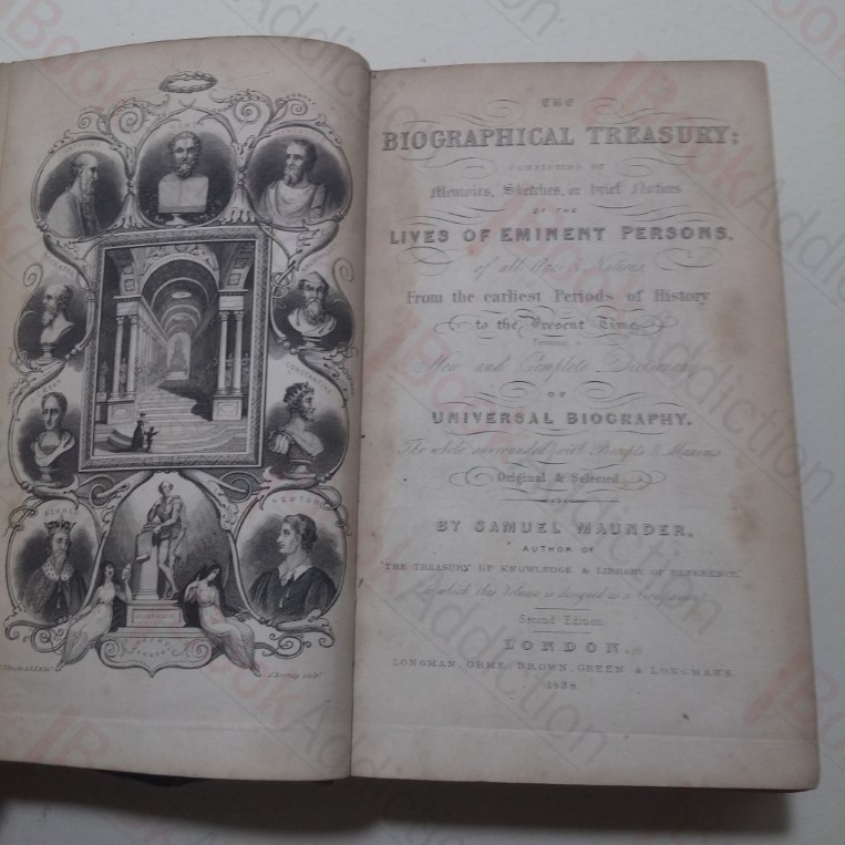 854pp. Half leather over marbled paper-covered boards, four ribs. Spine label missing. Heavy wear to extremities, Spine cover partially detached at front board. Top text block edge sprayed. Cover detached from volume at front endpaper. Presentation plate on front paste down. minor worm damaged on first few pages. Internally neat, clean bright and tight. 12mo. Consisting of Memoirs, Sketches, or brief Notices of the Lives of Eminent Persons of all Ages & Nature From the earliest Periods of History to the Present Time Forming a New and Complete Dictionary of Universal Biography, The whole surrounded with Precepts & Maxims Original & Selected by Samuel Maunder Author of The Treasury of Knowledge & Library of Reference to which this volume is a companion.