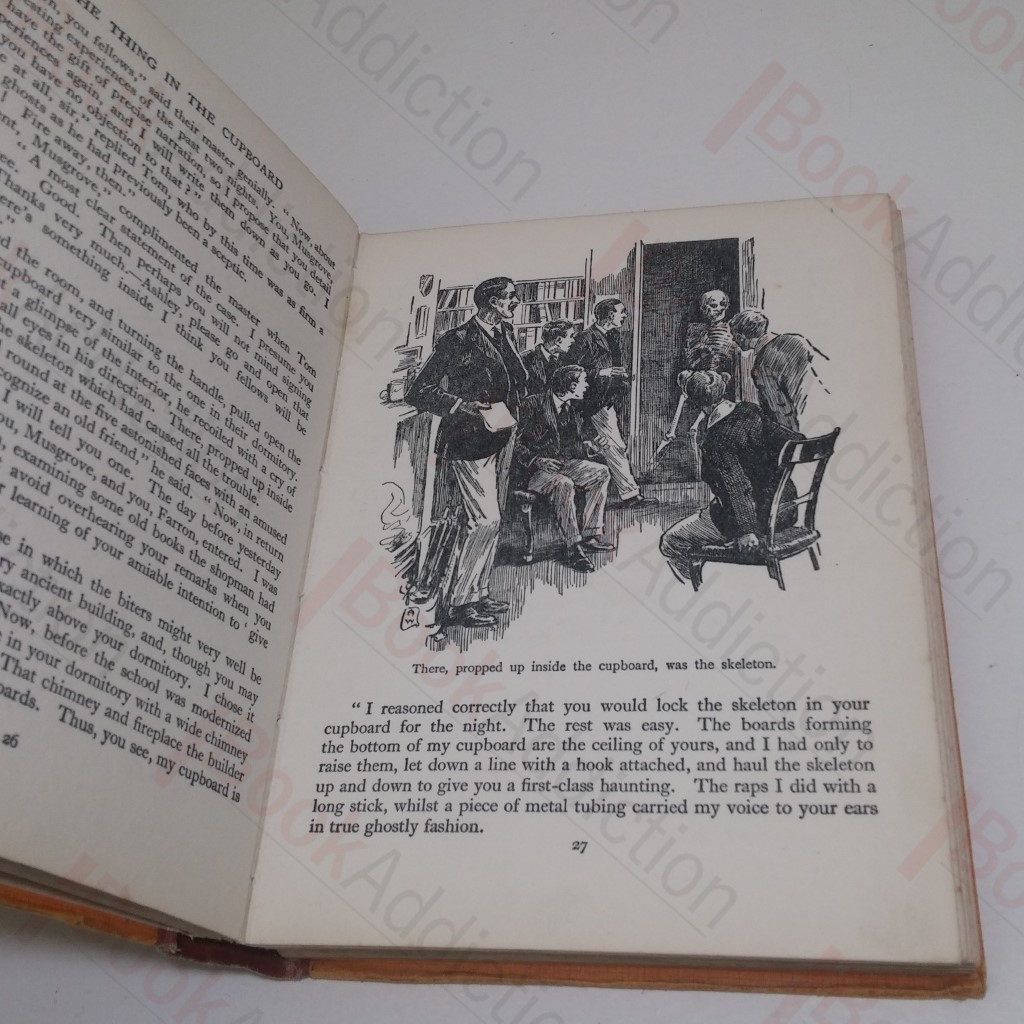 [1930]. 96pp, with colour plate frontispiece and numerous full page and in text drawings. In decorated orange cloth-covered boards with titles front and spine. 8vo. Cloth a little worn all over, rubbed and rounded at corners and spine ends, upper text block edge dust-marked, hint of spotting on endpapers only, a little loose but holding. In its original, worn and torn, dust jacket, with loss along top and bottom edges and at spine ends, but majority of illustration still there. A collection of vintage, illustrated short stories for boys. Authors represented in volume include Ethel Tablot and A Harcourt Burrage.