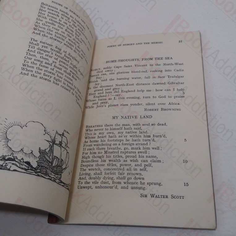 Undated (circa 1950s). 64pp. Black and white frontispiece. Red linen over card covers, stapled through; black titles and fleur-de-lis pattern on cover. 12mo. Sun-faded spine and top 1cm edge of front; staples oxidising. Very light soil marks on front. Dusty top text block edge, remaining edges just starting to fox. Previous owner’s name on front free endpaper. Internally, neat, clean, bright and tight. Decorative border on title page with vignette. An anthology of verse for use in schools.