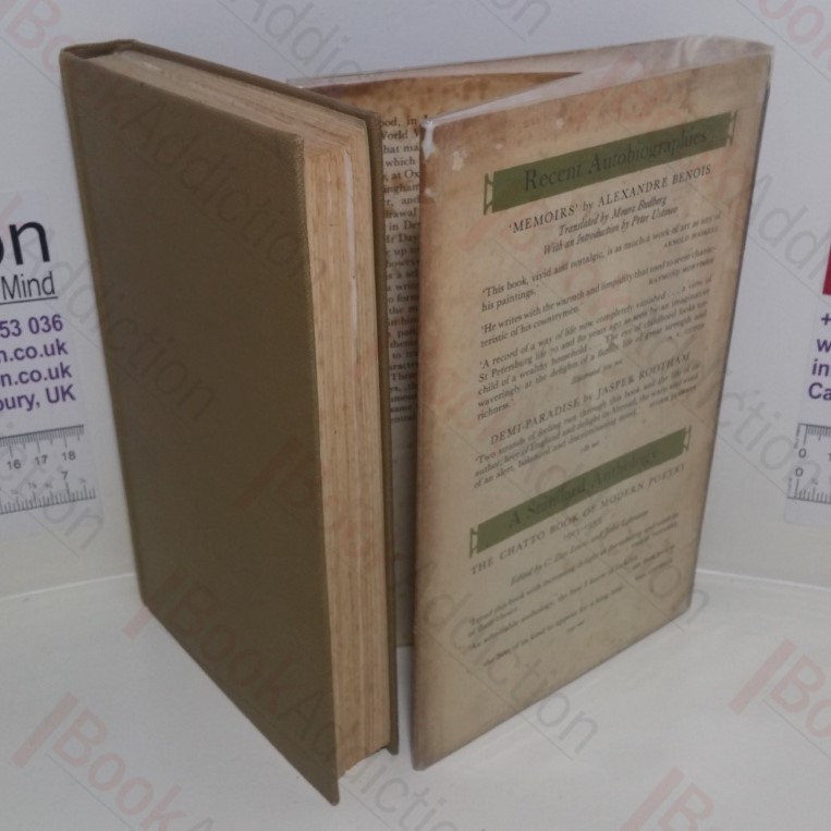 244pp, 12 black and white photographic plates. Green cloth-covered boards, gilt titles on black spine label. Bumped spine ends. Slightly cocked. Text block edges sunned and foxing. Front gutter strained. Signed by author on a label in blue pen and pasted to front pastedown ‘C Day Lewis.’ Previous owner’s name and address on front pastedown, and gift inscription on front free endpaper. One of the plates laid-in. Internally neat, clean, bright and tight, barring occasional foxing. Dust jacket in Brodart style sleeve, has small areas of loss at spine head, light shelf wear, chipping to edges, mirrors book damage, price unclipped. Flaps foxed. 8vo. The first volume of Cecil Day Lewis’s autobiography covering the period from his birth to 1940.