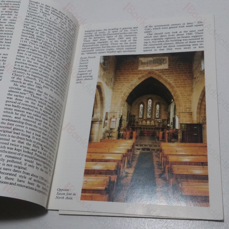 12pp stapled booklet, illustrated in colour, in light card laminated covers. 8vo. Covers a little faded and rubbed at edges, one corner has slight curl. Internally neat, clean, bright and tight. A card detailing points of interest in Eyam Parish Church loosely laid in. Also loosely laid insix black and white photographs of points of interest in Eyam village (two of the parish church, one mural inside the church, one of Mompesson’s Chair in the parish church, one of the old cross and one of the sun dial. The photographs are in very good condition and would appear to date from the 1970s.