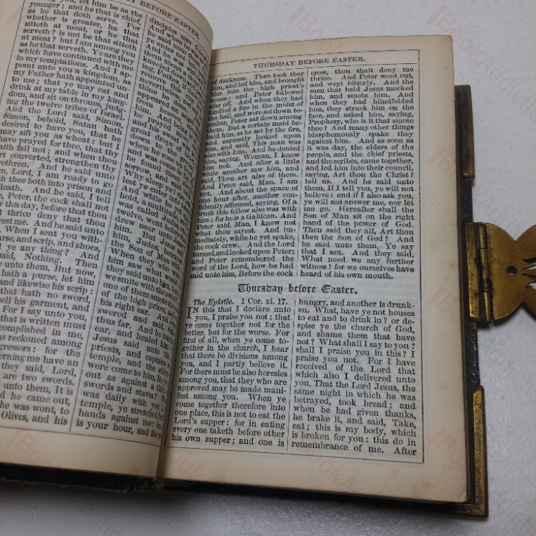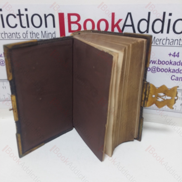 Bound in fill brown leather with brass clasp and boss corner pieces, four raised bands to spine.  All edges gilt.  Brown endpapers.   32mo.  Covers are a little dull and rubbed around edges and spine.  Some residue around brass clasp and bosses on rear panel.  Internally a little scattered spotting on first and last few leaves and occasionally and very mildly throughout.