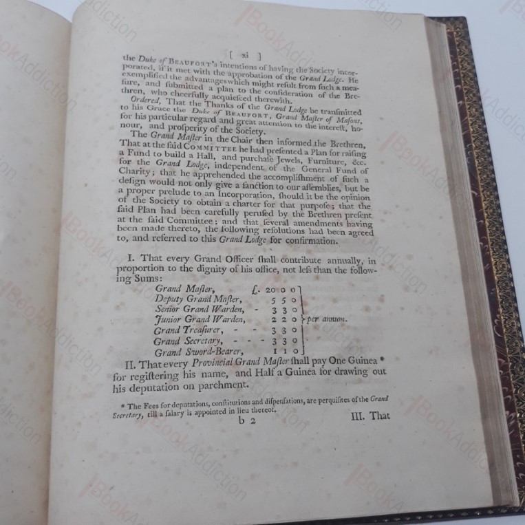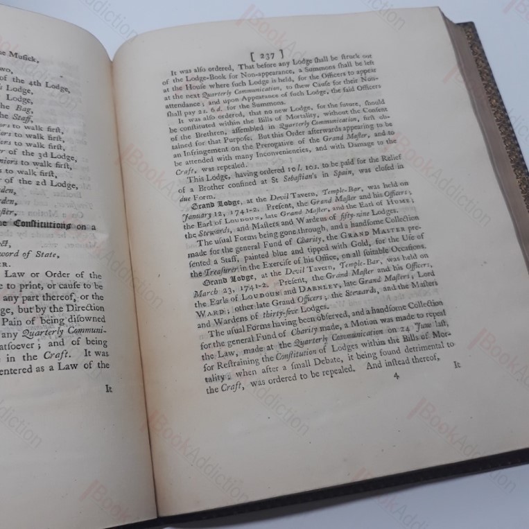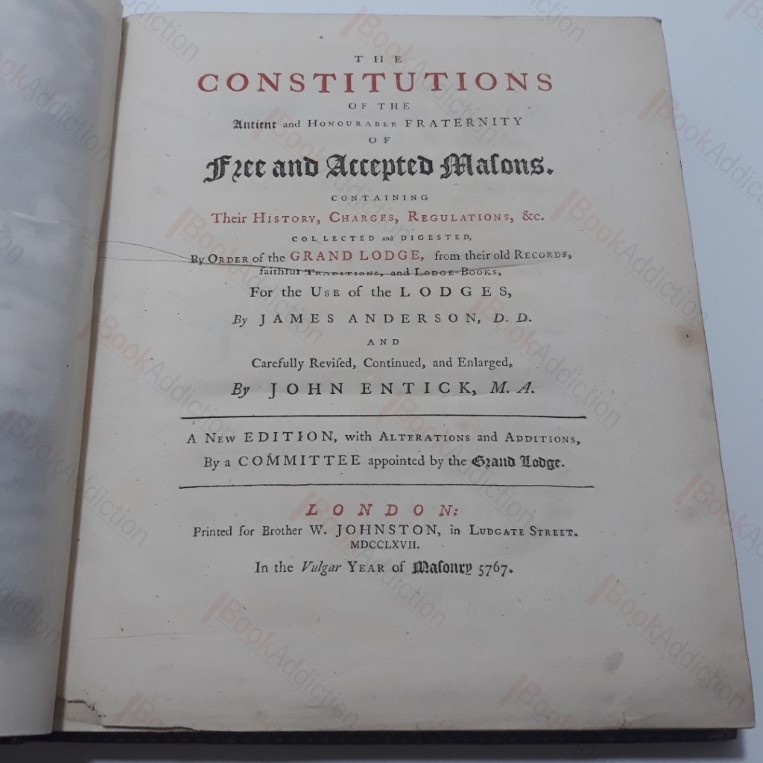 Carefully revised, continued and enlarged by John Entick, a New Edition with Alterations and Additions, By a Committee appointed by the Grand Lodge. vi, 368, lxxv, [5]. In a later, 19th binding, bound together with later, 1776, appendices. Handsome volume, bound in full morocco leather with gilt decorations and motifs to front and verso, five raised bands to spine, gilt lettering and decorations on spine. All edges gilt. Gilded inner dentelles, marbled endpapers. Engraved frontispiece with tissue guard, title page printed in black and red. Boards lightly rubbed at edges and spine joints, scuffed around head of spine. Front free endpaper is partially detached. Some mild spotting, with occasional pages showing some soiling, tissue-guard is fragile, else internally neat, clean, tight and bright. An important and early edition of one of the founding texts of freemasonry. Anderson’s first edition of the collected constitutions and regulations was published in 1723 and went through several editions. This edition was updated and revised by John Entick. Small 4to. A large and heavy volume which may require an additional charge for overseas delivery.