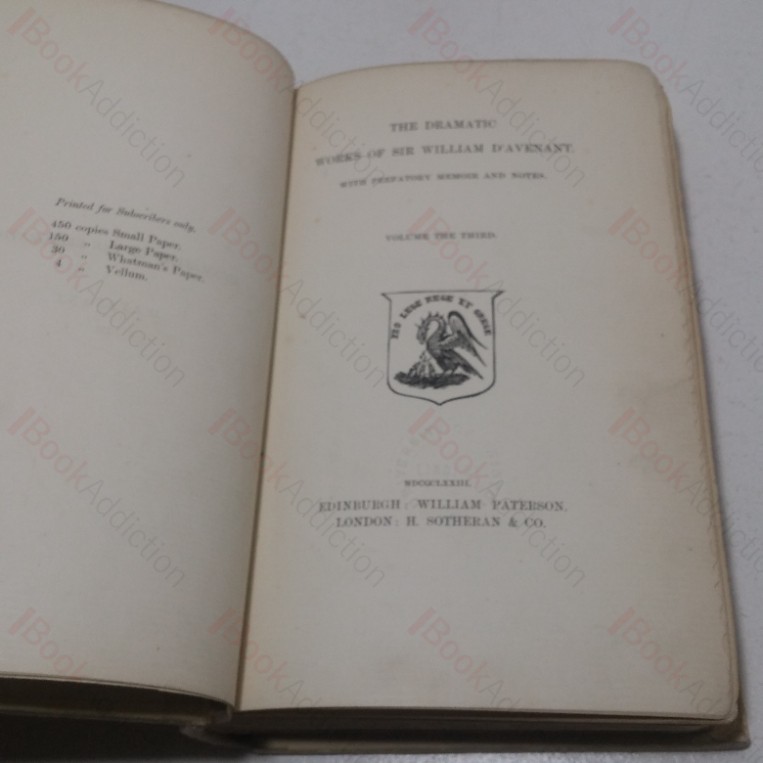 This edition of the dramatic work of the English Renaissance poet and playwright, Sir William Davenant (also spelt D’Avenant) was issued in 1872/3 for subscribers only in limited edition of 634 copies.