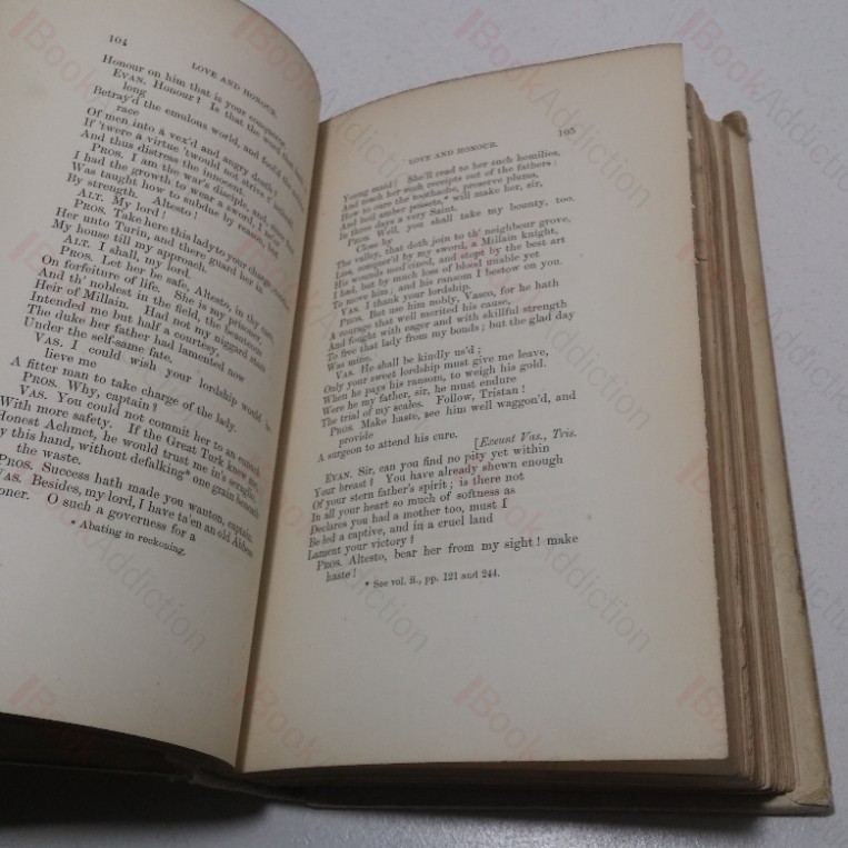 Volume III only (containing The Unfortunate Lovers; Love and Honour; Entertainment at Rutland House; and  The Siege of Rhodes).  366p.  Quarter bound in vellum, with cloth spine.  8vo.  Boards heavily worn and soiled, rubbed  and rounded on corners, labels affixed to spine.  Ex university library with usual markings on replaced endpapers and title page.  Pages have some light toning and general signs of use and reading else clean and neat. Remains tight with robust binding.