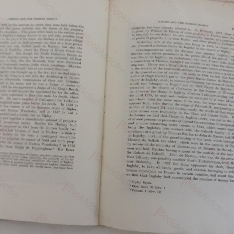 56pp, plus two genealogical tables relating to the Roos family. One of forty copies printed. Card wrappers with yapped edges (wrappers rubbed, chipped and faded at edges, small hole on back, but basically still strong and binding holding). There is a bookplate affixed to the first leaf, and some minor occasional spotting, else internally fresh and tidy. A detailed account of the history of the ancient market town of Ripley, just north of Harrogate, from its first mention in the Domesday Book to towards the end of the 15th century, with a special focus on the association of the town with Ingilby Family of Ripley Castle and the Roos family who had some claim to local property.
